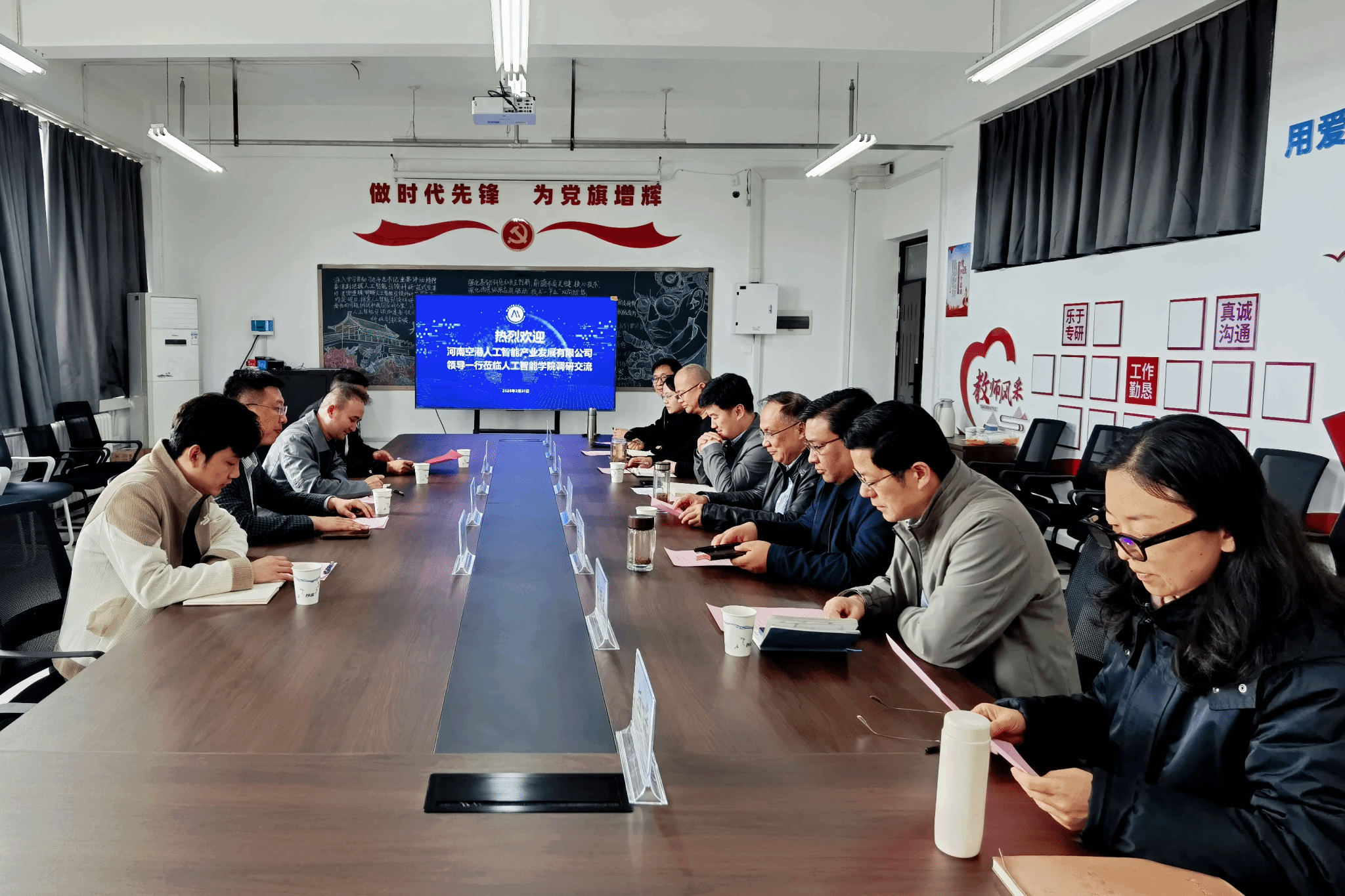 会上,williamhill威廉希尔院长陈东义代表学院对李高强一行表示欢迎,全面介绍了学院的发展历程、班子架构、师生规模、团队资源及科研特色方向,并希望共同探索合作路径,优势互补、资源共享,实现引领式发展。李高强详细介绍了河南空港人工智能产业发展公司概况及AI+X多元化课程体系、AI算力、AI实验室、产业学院建设等核心业务布局,以及地域资源与算力建设优势,表达了合作愿望。随后,双方聚焦当前人工智能技术发展应用热点、教学改革、实习实训、科研项目共建、全链条威廉希尔、高质量充分就业等议题进行充分探讨。