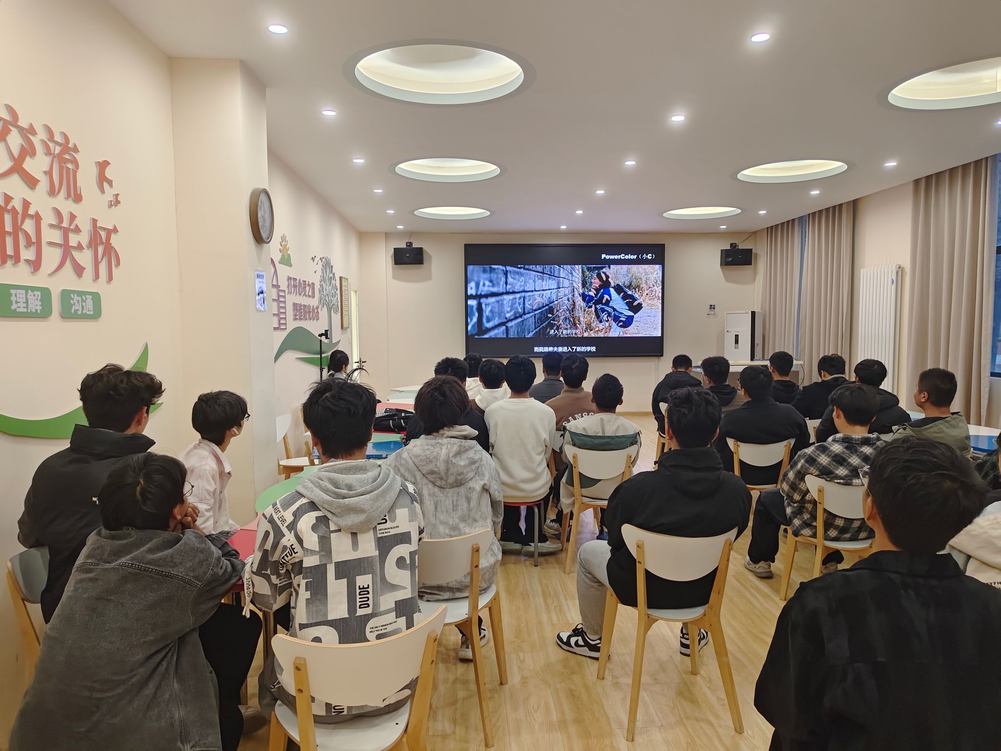 活动现场经过精心布置,为同学们营造了沉浸式的观影氛围。大家集中观看了精心挑选的AI主题心理微电影,影片聚焦AI技术伦理、人机关系等核心议题,以生动的剧情呈现了科技发展对人类心理状态、情感认知的影响,引发了同学们的强烈共鸣。
