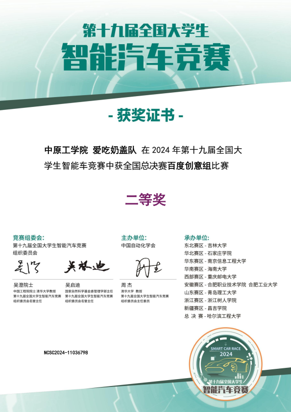 2024年8月22日,由中国自动化学会主办的第十九届全国高校智能汽车竞赛总决赛在哈尔滨工程大学圆满闭幕。总决赛共有来自清华大学、华中科技大学、哈尔滨工业大学、北京航空航天大学等在内的全国236所高校、550支队伍,分12个组别开展同台竞技。williamhill威廉希尔学生邹啟华、曾令洁、朱志远和自动化与电气工程学院学生许育通、张涵煜组成的“爱吃奶盖队”参加了百度智慧交通创意组竞赛,williamhill威廉希尔教师张慎武和许进忠担任指导教师。经过激烈角逐,“爱吃奶盖队”在第一天摄像头连线意外折断的不利情况下,沉着冷静地解决问题,最终以优异的成绩获得国家二等奖。这是我院学子第一次参加该项赛事。